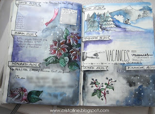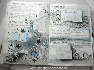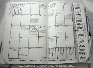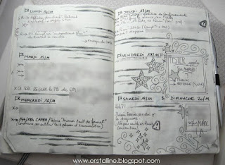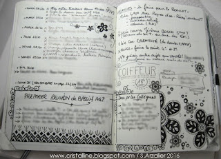 Finalement, après deux mois d'essai, je préfère mettre de petits espaces à gauche pour les tâches journalières et la page de droite restant vierge, elle sert désormais de "to do list" de la semaine (me suis rendue compte qu'il me fallait parfois 3 jours pour faire un truc que j'avais noté à une date précise ...). En cas d'espace non rempli, ça peut devenir une page de choses diverses et variées, ou de dessin.